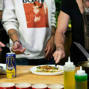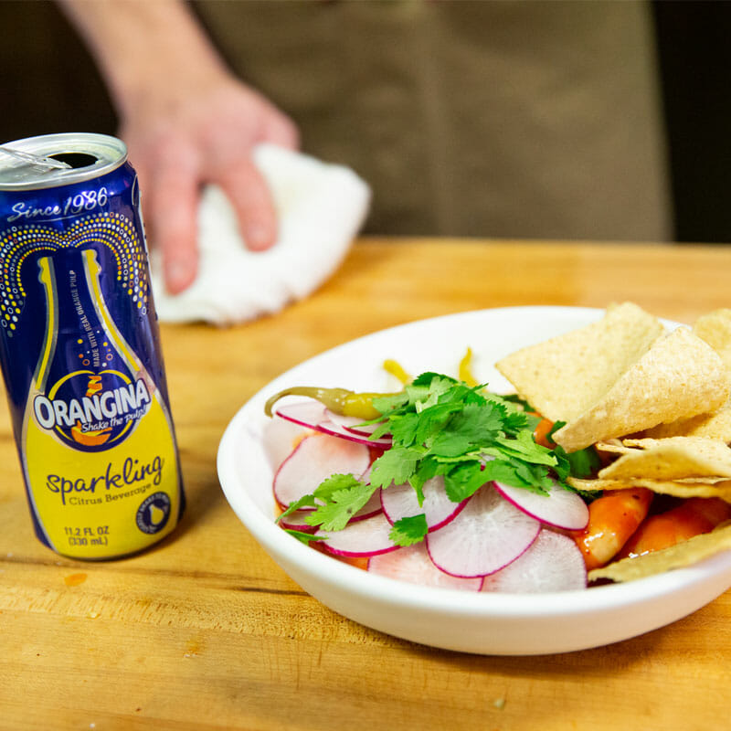 Pour the Coctel into a serving bowl. Garnish with Radish, Guinadilla Pepper, Cilantro & Tortilla Chips.