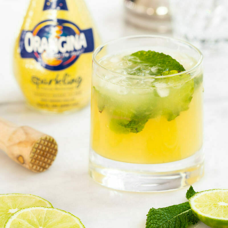 Muddle mint, simple syrup and lime juice in a serving glass. Gently shake up Orangina. Fill the glass with ice, slowly fill with Orangina, stir to mix.
