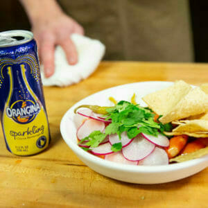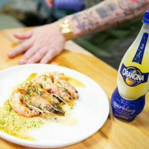 In a mixing bowl combine chopped parsley, zest and juice of 1 lemon, extra virgin olive oil and salt until you reach a paste-like texture. Then add a splash or Orangina.