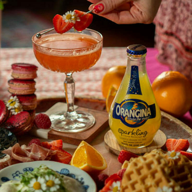 Add Strawberries to shaker and muddle, add honey syrup, gin, and lemon to shaker, shake then strain into a coupe glass and top with Orangina. Garnish with strawberries and edible flowers. Omit Gin for a mocktail.